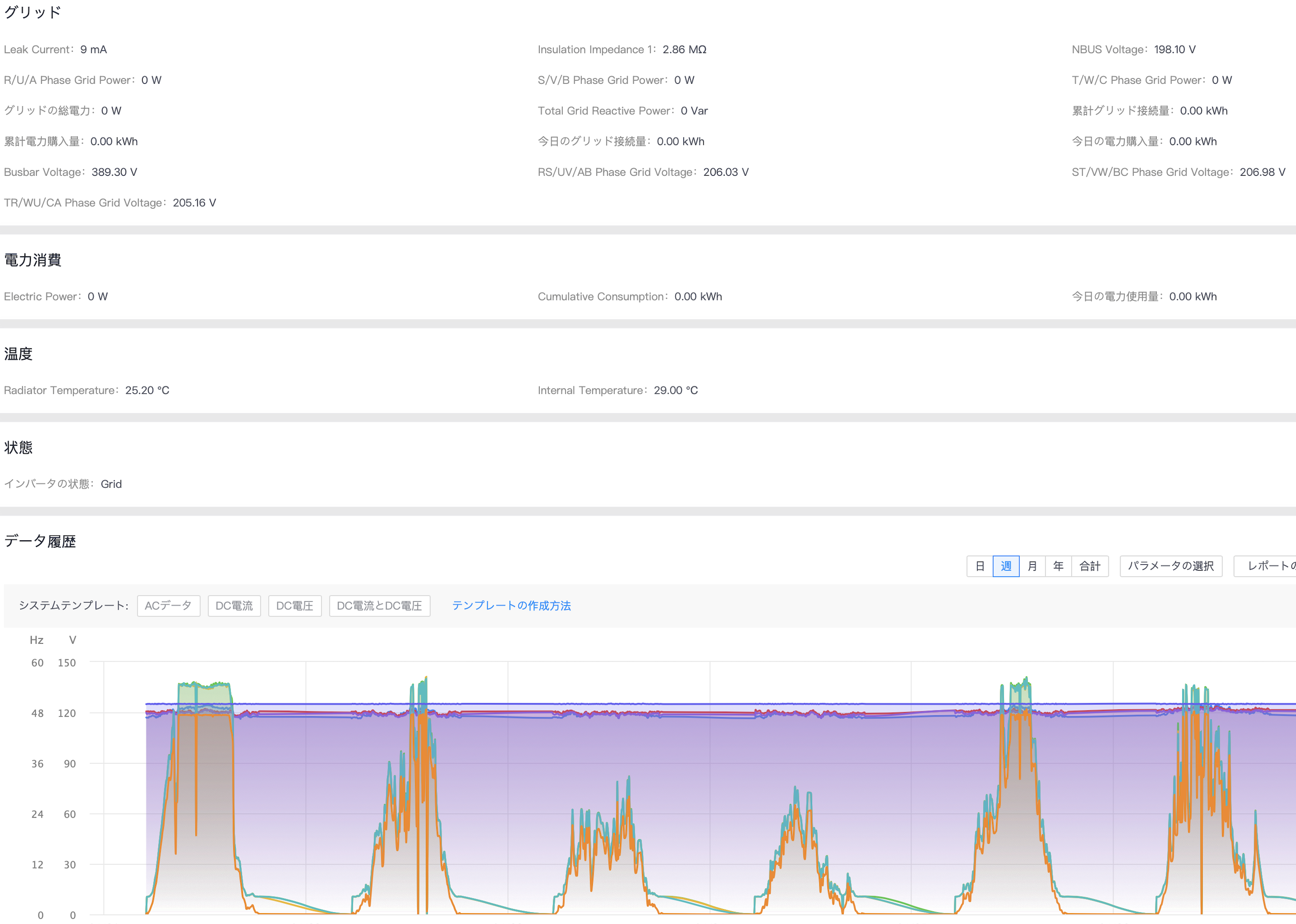 パラメータが多い発電モニタ 2025年10月14日 (カテゴリ: 三相パワコン, 監視装置) ツイート Afore PCS に付いているサービスの発電モニタ。 PCS毎にいろんなパラメータがみれて発電状況が確認できる。 みれるパラメータが多すぎて全部は理解できない。 今度Hauweiのスマートロガーも使ってみるので、それと比較してみたい。 Hauweiは、監視モニタをみる為にスマートロガーと、その専用SIMが必要。 このモニタはスマートロガーのような監視する為の専用機は不要。 接続もWIFIがあればLANケーブル接続も不要で設置が簡単だった。 参考になれば幸いです。 « 前の記事へ 次の記事へ » ツイート 関連記事 リプレース簡単 三相パワコン このパワコン 他社の9.9KWパワコンは、他社ドイツのS社ほか国内のものと比較して重量が半分以下、これなら一人でも簡単に設置可能です 記事を読む 三相パワコン 代替機で悩む 三相9.9KW の代替機をみつけました。メジャーではない。 どうかなーと試して6ヶ月 今のところ満足。 SMAが頻発して壊れ、保 記事を読む 発電モニタ AF000のパワコンには、発電モニタがついてます。 海外製のものはついているのが多いようですね。 このモニタ、パワコン毎に沢山の 記事を読む コメントを残す コメントをキャンセル コメントを投稿するにはログインしてください。