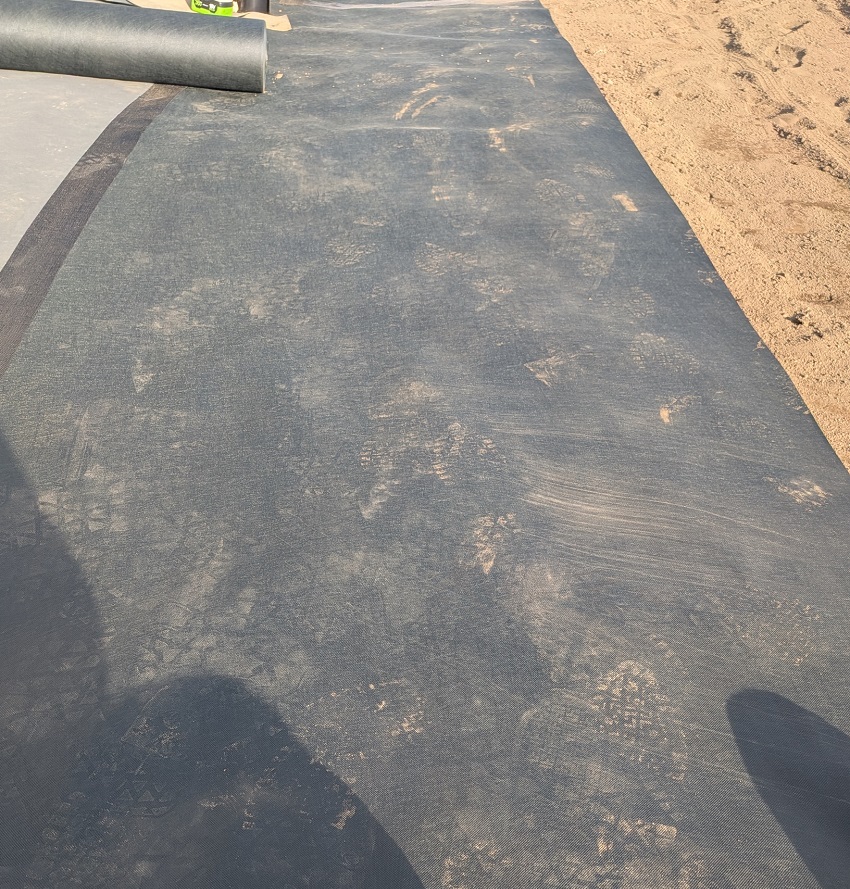 「雑草対策」。 前回は1㎡あたり100gのポリエステル(PET)不織布を使用してきましたが、今回はさらに強度を求めて150g/m²の気持ち厚手タイプを試験的に導入してみました。