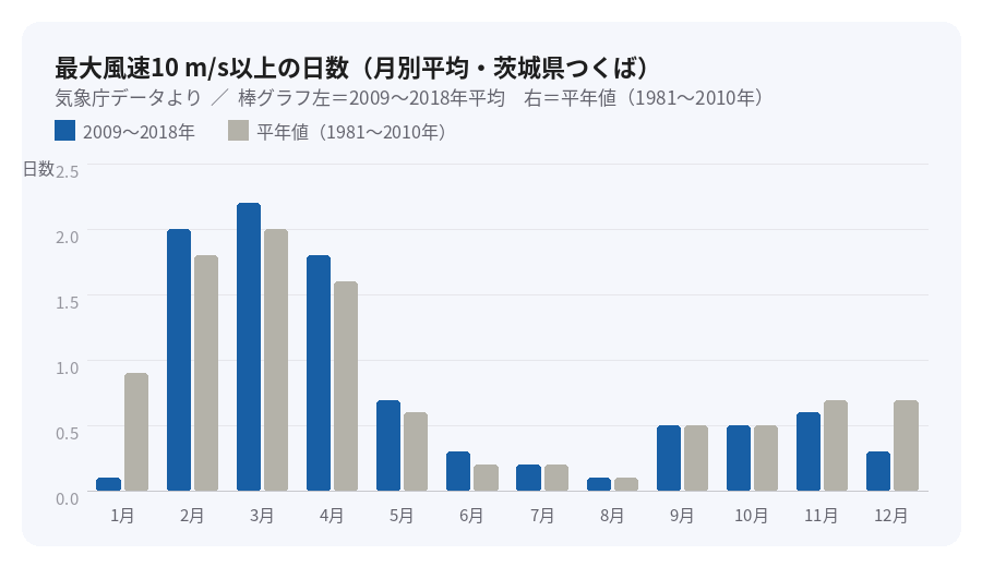 「台風の9〜10月では?」と思われがちですが、実は違います。気象庁の観測データをもとにした研究によると、茨城県つくばで日の最大風速が10 m/s以上となる日数が最も多いのは2月〜4月、すなわち冬の終わりから春先にかけてです。