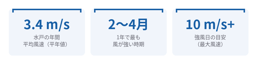 気象庁の平年値(1991〜2020年)によると、水戸の年間平均風速は約3.4 m/sで、これは全国の県庁所在地の中でも比較的風が強い部類に入ります。