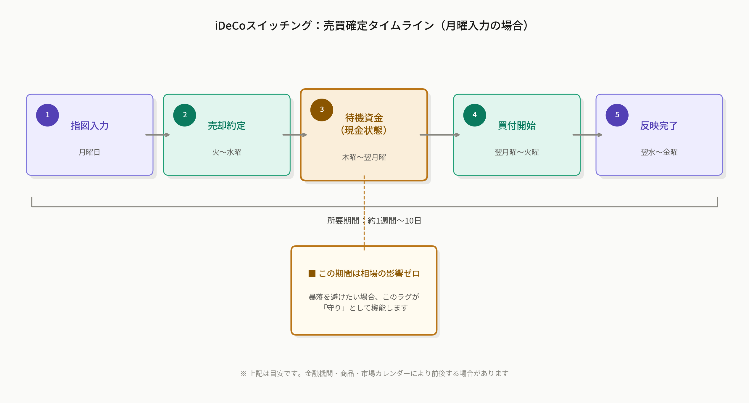 スイッチング自体に手数料はかかりませんが、信託財産留保額の有無は事前確認が必要です。売却から新商品反映まで1週間〜10日かかり、この間は相場の影響を受けません。定期預金へ避難しても、口座管理手数料(ネット証券で月約171円)は発生します。全額でなく「部分リバランス」という選択肢もあります。