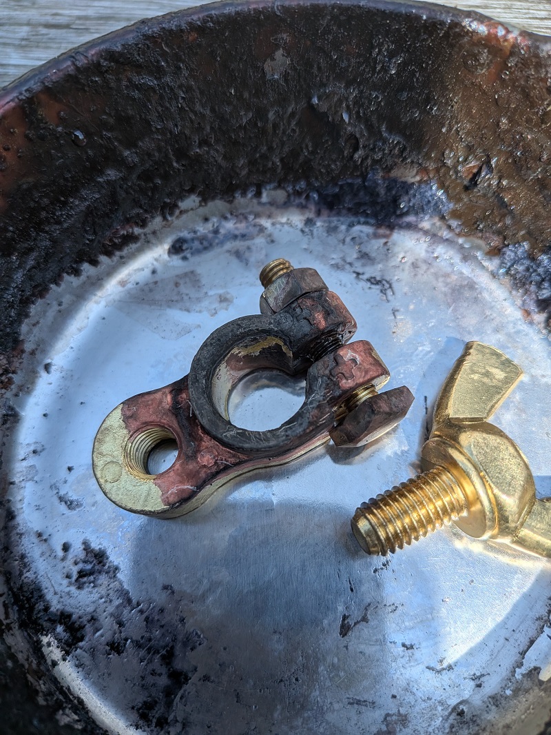 硫酸鉛の結晶は水に溶けやすい性質があります。60〜80℃程度のお湯を端子にかけて、古い歯ブラシなどでこするだけで、見た目はほぼきれいになります。