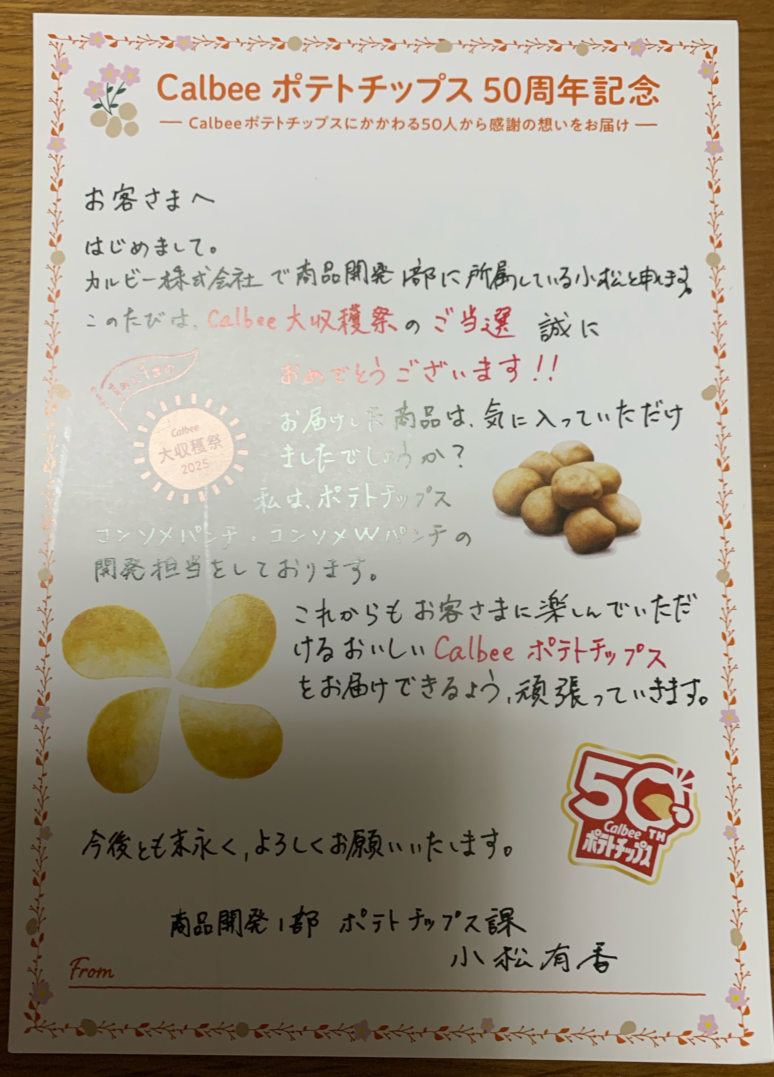 当選しました! 2025年11月8日 (カテゴリ: 未設定) ツイート Calbeeポテトチップス50周年記念の カルビー大収穫祭2025キャンペーン 当選しました🎵純粋に嬉しいですね。 こんなのに当選するのは、もはや 都市伝説と思ってました。 ジャガイモにお菓子BOX、それに ポテトチップス。 しかも2種類あっていい方が当選。 やはり、生きているといい事が ありますねー。 « 前の記事へ 次の記事へ » ツイート 関連記事 内閣総理大臣顕彰 今日、藤井八冠に内閣総理大臣顕彰式 が行われたとニュースで見ました。 藤井八冠は先日の竜王戦でも 三連覇を果たしタイトル戦 記事を読む 国内最大級 洋上風力発電所 運転開始 おはようございます。 「洋上風力発電」の国内最大級の 発電所が、運転を開始したらしいです。 石狩市と小樽市にまたがる石狩湾 記事を読む 昨日は岡山県で、今日は、福岡県で朝ラーメン おはようございます。 昨日から福岡県に来ています。 首題にあるように、昨日はルーティンの ドジャース戦を観戦後、岡 記事を読む 新幹線平日1万円乗り放題 キュン♥パス復活 JR東日本は、おトクな平日旅をサポート する平日限定商品キュン♥パスを、 1月13日からえきねっとで発売する。 1日用が好 記事を読む 発送6件待ち おはようございます。 今日メルカリの発送が6件あります。 売れたのは、嬉しいのですが6件と なると少し憂鬱になります‥ 記事を読む アメリカで去年、太陽光発電の設置容量が最も多かった州は おはようございます。 米国で2023年の1年間で太陽光発電の 設置容量が最も多かった州は⁈ その答えは、テキサス州らしいで 記事を読む トランプ大統領 今日来日 おはようございます。 今日トランプ大統領が来日しますね。 天皇陛下でもないのに、凄い警備 態勢です。警備に1万8,000人 記事を読む 予選結果 おはようございます。 もうすぐ決勝がはじまります。 もちろん朝4時から起きて見ています。 予選は、レッドブルのフェルスタッ 記事を読む 確定申告 おはようございます。 確定申告の期限が迫って来ました。 太陽光の確定申告をお任せしている 顧問税理士から昨日電話あり、 記事を読む すぐ近くで太陽光発電所から銅線約1,800万被害 私の住んでいる広島県内のすぐ近くで 太陽光発電所から銅線時価1,800万円 相当を盗んだ疑いでベトナム国籍の 男3人を逮捕 記事を読む コメントを残す コメントをキャンセル コメントを投稿するにはログインしてください。
