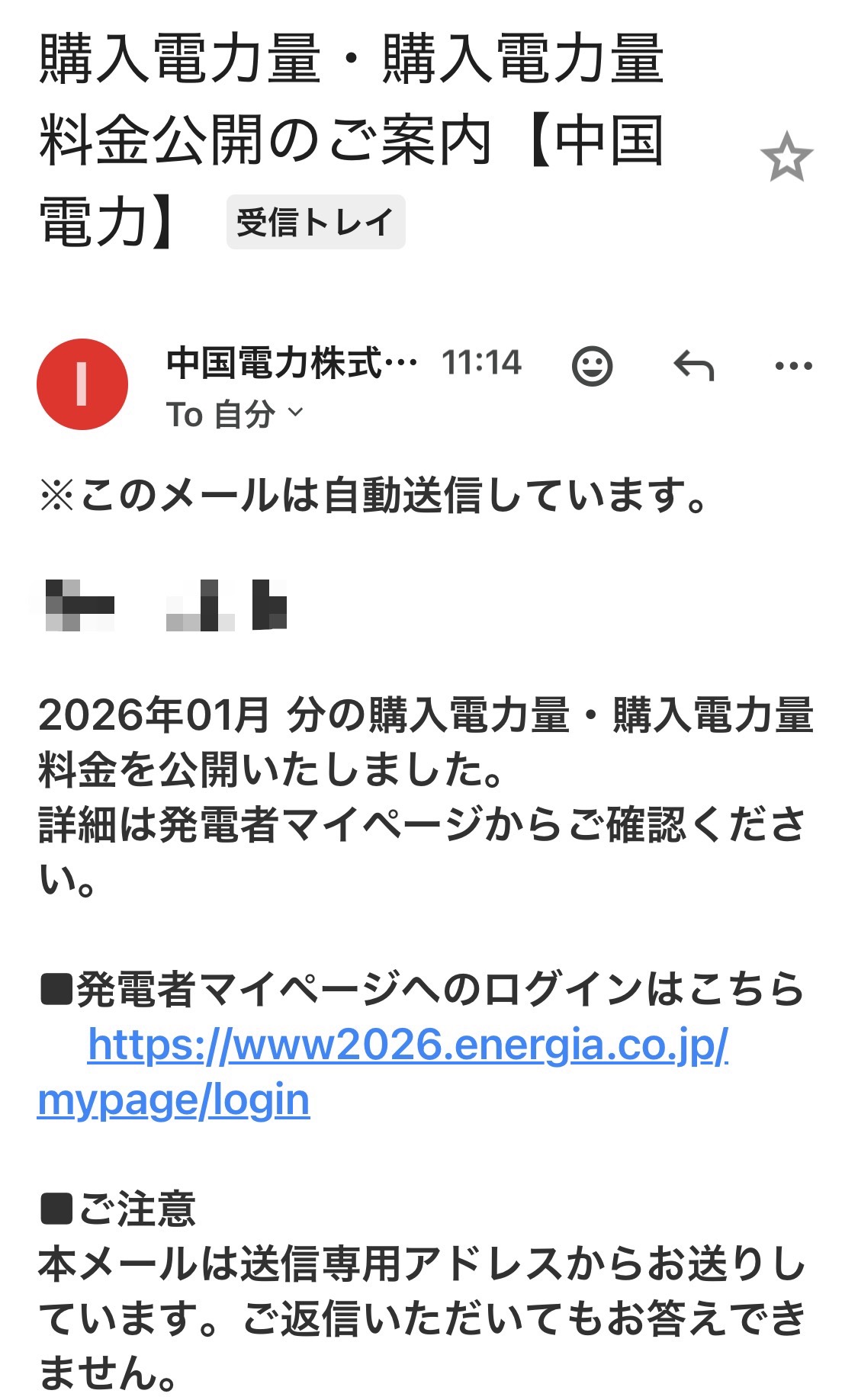 購入電力量・購入電力量料金公開のご案内 2026年1月21日 (カテゴリ: 未設定) ツイート こんにちは。 やっと先程、今月の購入電力量・購入 電力量料金公開のご案内が届きました。 葉書が今月から届かなくなったのは、 いいが葉書より、丁度1週間遅い。 はっきり言って、1週間も遅いのなら 葉書の方が全然良かった。 便利になって早くなるのが普通だと 思うが、不便になって遅くなるとは 流石、中国電力。 « 前の記事へ 次の記事へ » ツイート 関連記事 残念な発電所 今日も暑いですね 昨日、1時間の電車の旅でも残念な 発電所を車窓から何ヶ所も見ました 。もう何 記事を読む 今日もご丁寧に‥ おはようございます。 今日もご丁寧に案内が届きました。 この季節フルに発電しても400kw も発電しないのに。 今年 記事を読む 政府が新たに行う電気の補助金 政府が新たに行う電気・ガス料金の 補助を巡り、政府は電気の補助金を 1kWhあたり2円程度とする方向で 調整、一般家庭では 記事を読む 18歳未満の「つみたて投資」 上限600万円 こんばんは。 18歳まで600万円、nisaが出来そう です。いいですねー、羨ましいです。 NISAを巡り、18歳未満に対 記事を読む 一個増量中 今、ローソンのからあげクンが 一個増量中で6個入りと大変 お得です。と言う事でビールの アテに買ってきました。しかも 記事を読む 今日は、七草粥 今日は、七草粥てす。 1年の無病息災を願って食べる 「七草粥」の風習で、春の七草(せり・ なずな・ごぎょう・はこべら・ほと 記事を読む 3回忌 50回忌 おはようございます。今日は、父親の 3回忌と弟の50回忌です。 天気も雨予報だったので、心配して ましたが、逆に昨日からは 記事を読む お年玉 今日から全国的に学校が始まり 大谷翔平選手から全国各地の 小学校で大谷グローブが お披露目されたようです。 今年3月 記事を読む 二の矢結果 こんばんは。 妻が30年以上勤めた会社を退職し、 2人とも無職になったので、妻に 投資をしろと言ったら、最近は よく 記事を読む 今日から25年度のnisa枠復活 先程、sbi証券の口座を確認した所 、昨日まで2024年度だったnisa枠 が2025年度になっており、買い付け が出来る 記事を読む コメントを残す コメントをキャンセル コメントを投稿するにはログインしてください。