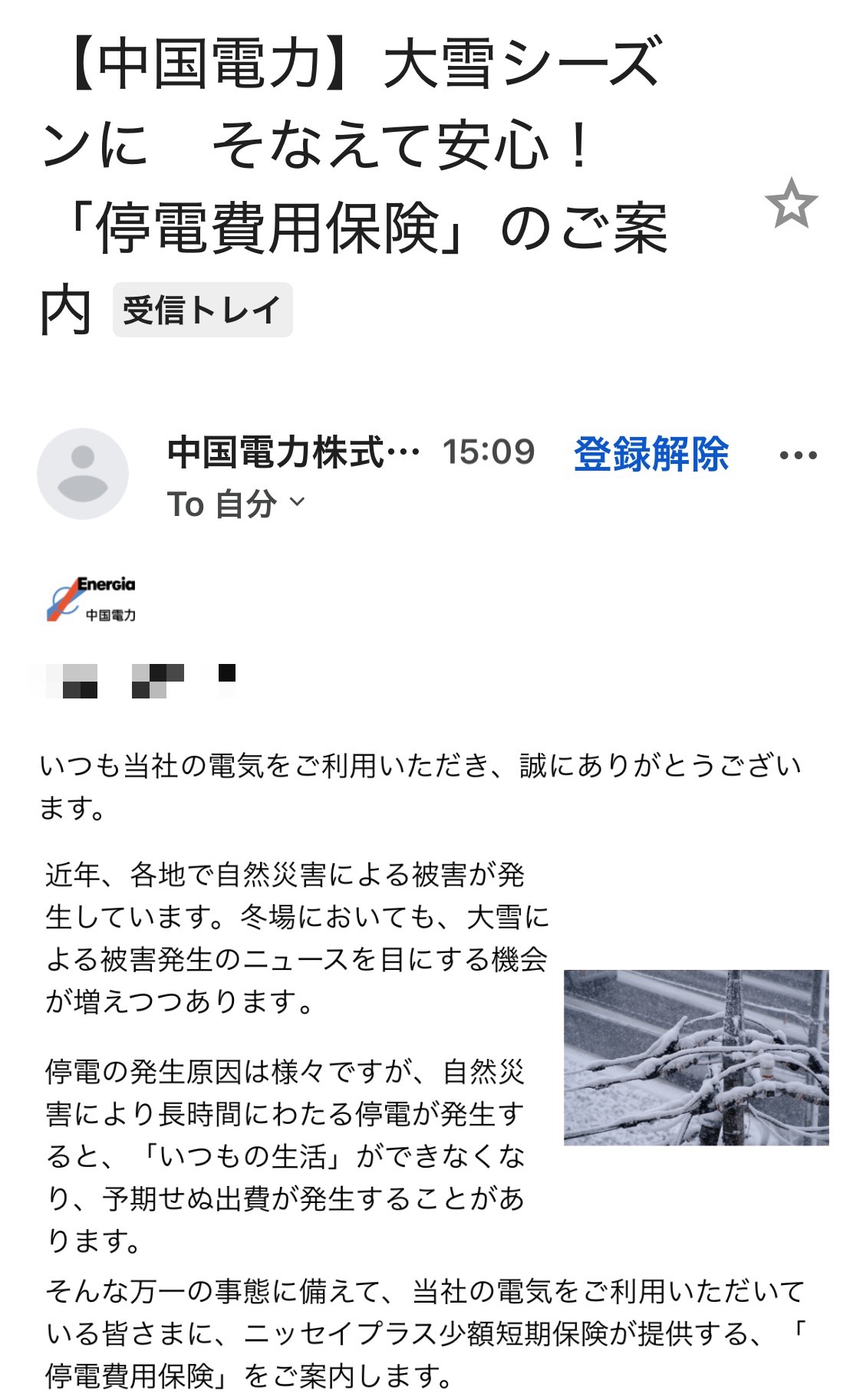 中国電力の停電費用保険 2026年1月21日 (カテゴリ: 未設定) ツイート 先程、中国電力から停電費用保険 なる案内が届きました。 月々160円で、5時間以上継続して 停電したら最大10,000円補償。 電力会社がよくこんなしょーもない 保険の案内を送って来るなと。 こんな事より、せめてfit10年過ぎ ても他の売電先が決まるまで最低 1年間は、買い取りを補償するとか 購入電力量のお知らせをまだ葉書 でも対応してくれるとかして 欲しかった。 « 前の記事へ 次の記事へ » ツイート 関連記事 今日は鉄道の日‥ 今日は鉄道記念日らしいです。 各地で色々イベントも。 写真は先月青春18切符で 広島から北海道まで行った 時に撮った 記事を読む 初めて石炭火力を上回る 欧州の太陽光 おはようございます。 欧州の電力供給において太陽光発電が 去年初めて石炭火力発電を上回った らしい。 太陽光は、EU 記事を読む 優勝から一転、悲劇の失格 優勝から一転、ラッセルが悲劇の失格 となりました。F1第14戦ベルギーGP は決勝が行われ、メルセデスAMGの ラッセルが 記事を読む 太陽光に続くバブル到来か 再エネ蓄電池事業 蓄電池の事業が、太陽光に続くバブル 到来かとひそかに賑わっています。 九州では出力制御が去年、5年前の約 13倍に達し、大 記事を読む 次は、1,100年後 こんばんは。 今日は、1,300年ぶりに地球に最接近 しているレモン彗星が一番よく見れ る日です。日本でも11月上旬にかけ 記事を読む 電波障害⁈ ひとまず復旧 朝からのエラーメッセージ連発。 早速現地で確認した所、パワコン の機械はそれぞれ異常ランプは ついてなく、正常。ブ 記事を読む 昨日は岡山県で、今日は、福岡県で朝ラーメン おはようございます。 昨日から福岡県に来ています。 首題にあるように、昨日はルーティンの ドジャース戦を観戦後、岡 記事を読む 二の矢結果 こんばんは。 二の矢の結果です。今月は、大きく マイナスだなぁと思ったら、今日 少し回復しました。まだまだ今月 マイ 記事を読む つくしが沢山 昨日発電所に行った時、つくしが 沢山生えている事に初めて気付き ました。もう何十回と行ってるん ですが‥ちょうどそ 記事を読む 津波避難タワーに太陽光発電 無事、N-NOSEの検体を提出して 来ました。津波避難タワーの環境改善 に向けて、太陽光発電システムの導入 を進めている高 記事を読む コメントを残す コメントをキャンセル コメントを投稿するにはログインしてください。