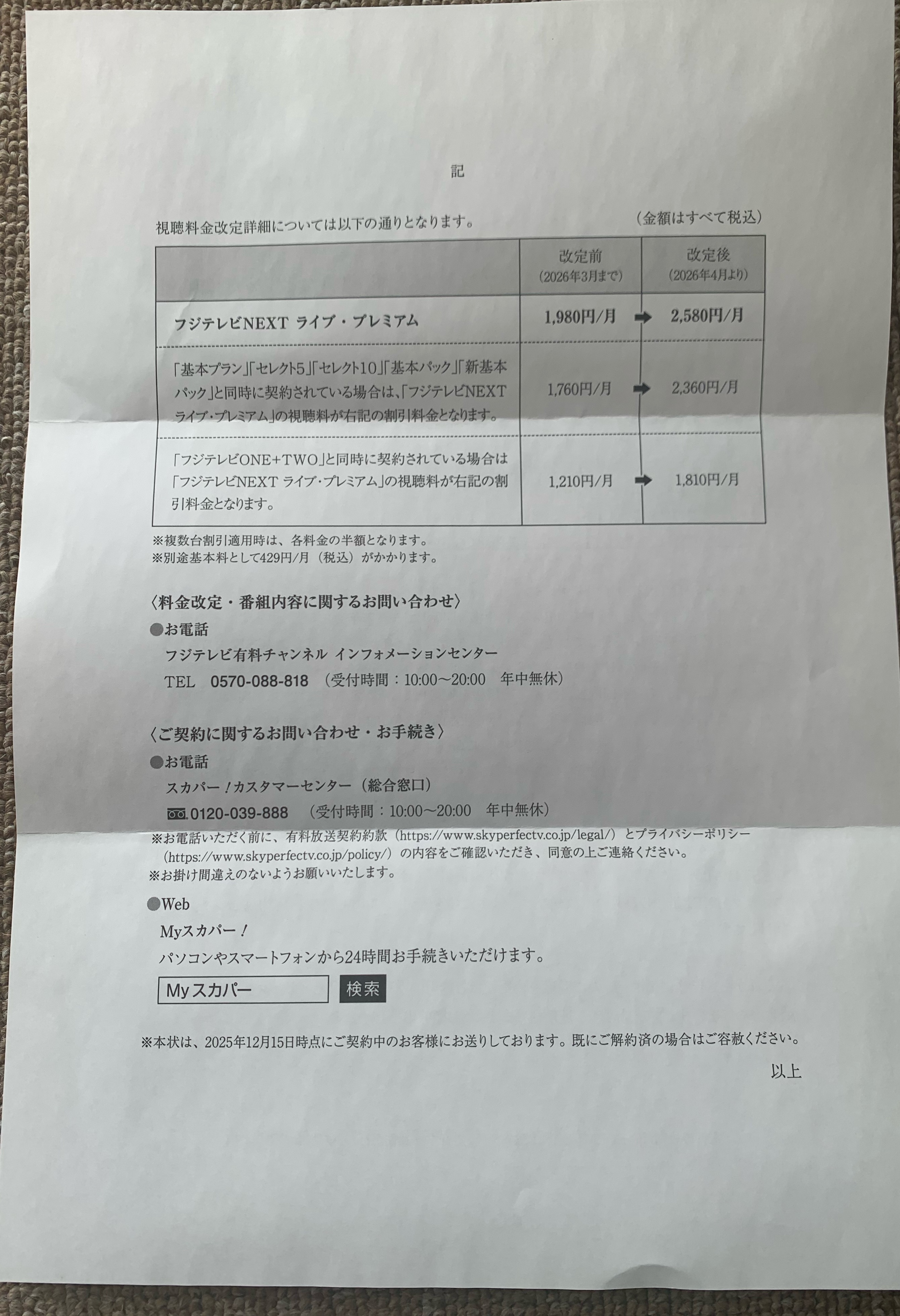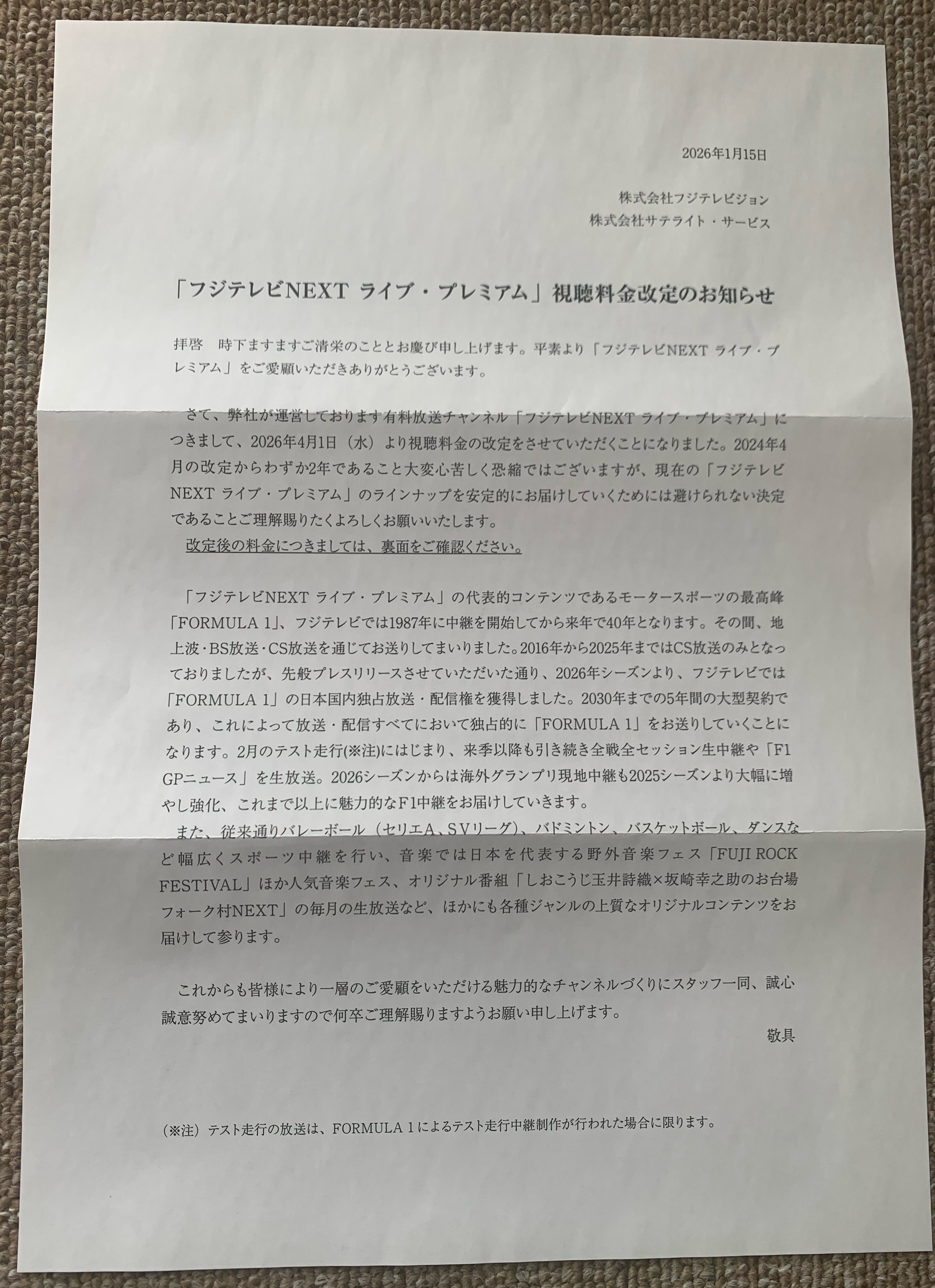 スカパー視聴料金改定 2026年1月29日 (カテゴリ: 未設定) ツイート 私が楽しみにしている、F1その 視聴料金も今年から値上げすると 通知が届きました。 現在、家にいる時間が圧倒的に 高い為、Netflixや Amazonプライム、 WOWOW、スカパーに入っています。 しかし、NetflixやAmazonプライム、 WOWOWはほとんど観ていません。 しかもメジャーリーグが開幕したら 今よりもっと見る頻度は圧倒的に 下がります。 スカパーは、F1を見る為に必要 なので他のNetflix等を見直すかな と思ったが妻が会社を辞めアニメ を見ているので辞められない‥ « 前の記事へ 次の記事へ » ツイート 関連記事 実家に集合 今日は、実家に弟家族や私の子供 に甥っ子と行きました。 母が、唐揚げや豚カツにサラダ やポテト 記事を読む 日経平均株価 おはようございます。 日経平均株価ついに史上初めて 四万円の大台に入りましたねー。 今日は、どこまで値をつけるか 楽 記事を読む 安倍総理行きつけの名店 こんばんは。 生前、安倍総理夫婦の行きつけだった ふく料理店に行って来ました。 安倍総理行きつけだった店だけあって 記事を読む 正月早々にエラー表示 おはようございます。 正月早々の1月3日から1つの発電所 で、エラー表示が出て全く発電して いません。すぐ近くの発 記事を読む iPhone向け おはようございます。 iPhone向けにiOS18.7.3がリリースされ 、このアップデートには重要なセキュリ ティ修正が 記事を読む 紅白歌合戦の抽選結果 こんばんは。 今日、NHKから第76回NHK紅白 歌合戦の抽選結果が届きました。 結果は、やっぱり落選でした。 倍率 記事を読む 鏡開き おはようございます。 今日は、鏡開きですね。 正月に神や仏に供えた鏡餅を下げて 食べる日とされています。 神仏に感謝 記事を読む 隣地に太陽光発電所計画のお知らせ こんばんは。 今日、私が所有している発電所の 隣りに新たに太陽光発電所を作る と言うお知らせが届いた。 今は、新しい 記事を読む 「51-51」偉業達成! 「50-50」はやってくれると 思いましたが、「51-51」を やってくれました。これはまだ まだ記録伸びるかも。3打席連 記事を読む やってしまいました。 先程、中国電力から電話が。何かな と思ったら自宅太陽光が来月11月で 卒fitとなるのですが、次の売電先を 決めているか⁈ 記事を読む コメントを残す コメントをキャンセル コメントを投稿するにはログインしてください。