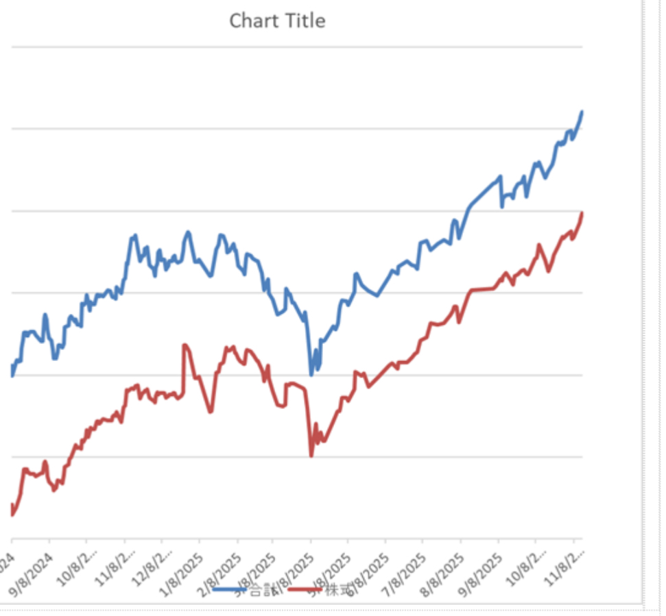 赤色が証券口座の評価額で、青色が預金と合計したグラフになります