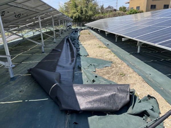 防草シートを敷きに発電所に行ったら、前回敷いた防草シートが捲れてました