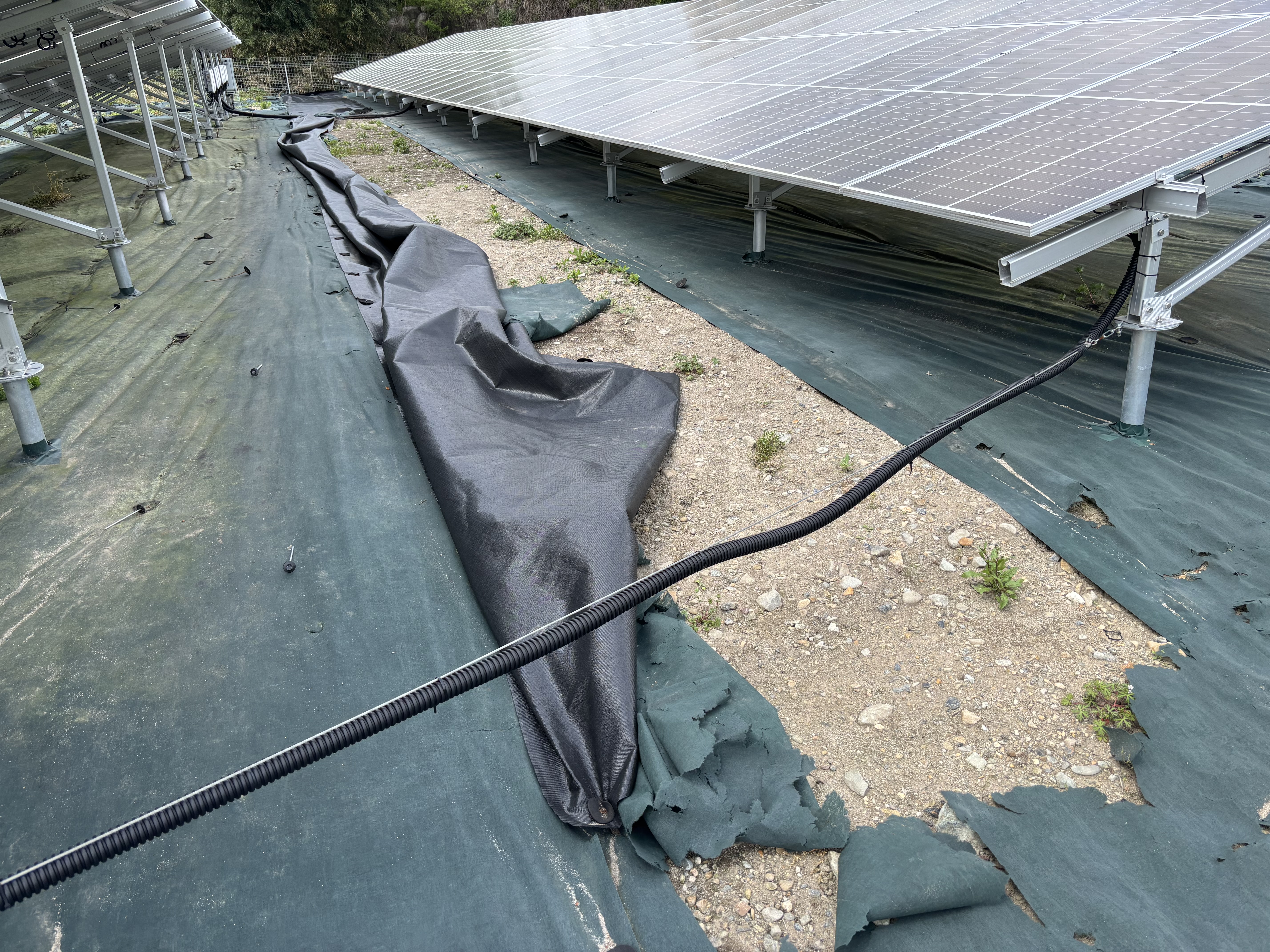 先日、防草シートが捲れて補修した発電所に他の用事で行ったらまた捲れてました