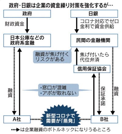 日銀も資金繰り対策に動き始めている。新型コロナウイルスの感染拡大で苦しむ企業に融資するための原資をゼロ金利で金融機関に貸し出す仕組みを新設。24日には第1弾として3兆4000億円を三井住友銀行や三菱UFJ銀行などに供給した。両行は25日、日銀から調達した資金を使って融資するためのファンドを立ち上げており、今後企業に資金が回っていく見通しだ。企業の資金繰り支援では政策金融が主役だが、「銀行の銀行」として日銀も側面支援する。