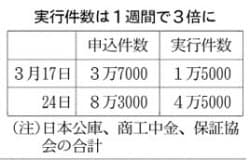 日本政策金融公庫、商工組合中央金庫、信用保証協会を合算した新型コロナウイルス対応の融資・保証への申込件数は24日時点で約8万3千件にのぼり、1週間で約2.2倍に膨らんだ。「最短1営業日で融資を承諾するケースも少なくない」(日本公庫幹部)としており、実行件数も約4万5千件まで増えた。だが、一部の企業は既存の借り入れ状況や焦げ付きリスクなどによって融資を十分に受けられないケースがあるようだ。