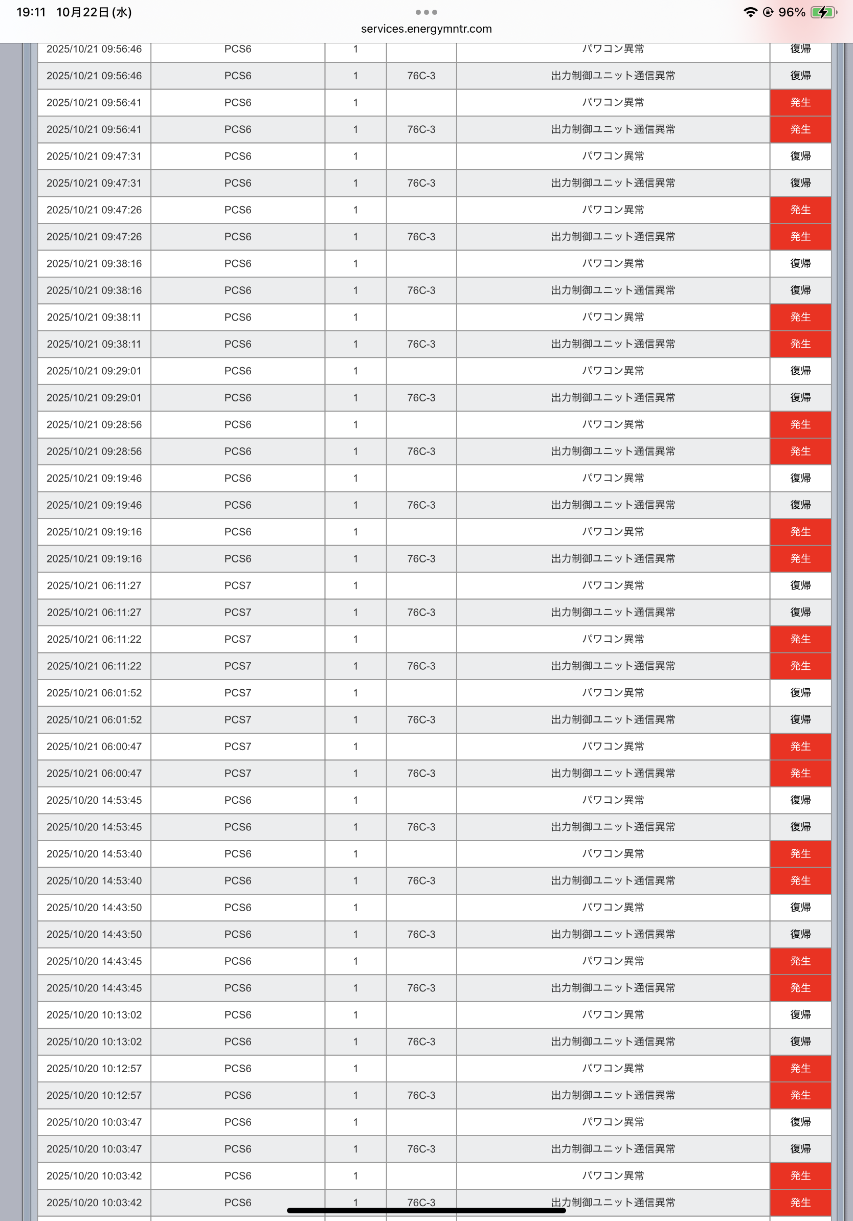 出力制御ユニットとパワコンの通信異常 2025年10月22日 (カテゴリ: 未設定) ツイート 出力制御ユニットはラプラス。 頻繁に通信エラーと復帰が繰り返し起きている。 通信配線の断線かと思ったがパワコンの通信基盤の不良の可能性がある。 そうなると、パワコンメーカーの技術者なり分かる人間に見てもらわないとダメです。 « 前の記事へ ツイート 関連記事 銅線保護方法考察② ドロボーが集電箱を勝手に開ける対策を考えてみたが、 ここのように下を板張りにしていればさらに板を蓋の前に貼 記事を読む 一見、間尺に合わん仕事のようですが🙄 はいこれ、発電所南側の竹林伐採。 前から記事にしているが、毎年毎回、いやーな気分である。 太陽高度の低い時期は影作るの 記事を読む 道具増やすと手入れも増える 除草剤撒くためにモーター動噴を発電所に持って行き動かしてみたが全然液を吸わない。 なんか詰まってるっぽい。 しょうがないのでジョ 記事を読む また信販ネタ 太陽光発電設備のクレジット契約に対応している会社は結構たくさんありますね。 アプラス、ジャックス、イオンプロダクト 記事を読む 無料の熱中症保険に入った 関電のはぴいみる電のユーザーは、無料で入れる。 今週末伐採作業があるので入った。しっかしこのクソ熱いのにう 記事を読む 妙なエラー DC過電圧のエラーメールが朝6時前に送信されてきた。 別の発電所で過電圧のエラー後にパワコンが壊れたことがあったがそれは落雷が 記事を読む ここまでやらせるか、世も末じゃのぉ〰 ケーブル盗難防止策ということで、幹線包んでいるエフレックス菅をさらに金属の角柱の中に通し、角柱内部から地面側まで 記事を読む 太陽光の認定Idの相続手続きに失敗した話を読んだ https://ameblo.jp/xevosigma/entry-12840461021.html はいこれ、他人ごとながらi dの 記事を読む 同類項 北九州の例の事件であるが、犯人は駐車場経営しているという話。 これとよく似た人物が↓の千葉県松戸で起きた事件。犯人はマンション賃貸業し 記事を読む ブタクサ放置でおk 夏の終わりからブタクサが繁茂して刈ろうかどうか迷っていたら勝手に減退してほっとくことにした。 これオオアレ 記事を読む コメントを残す コメントをキャンセル コメントを投稿するにはログインしてください。