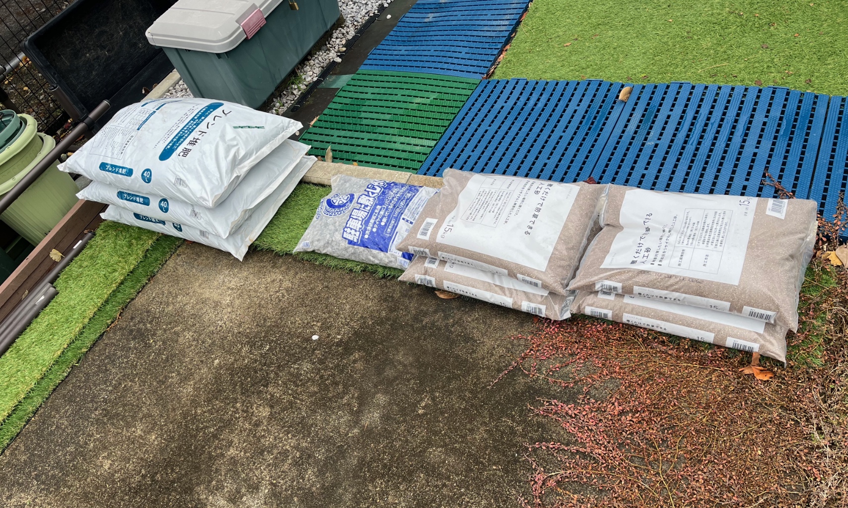 資材は、ホムセンで揃えてきました。軽自動車にこの量を乗せるのは大変・・腰が痛い。