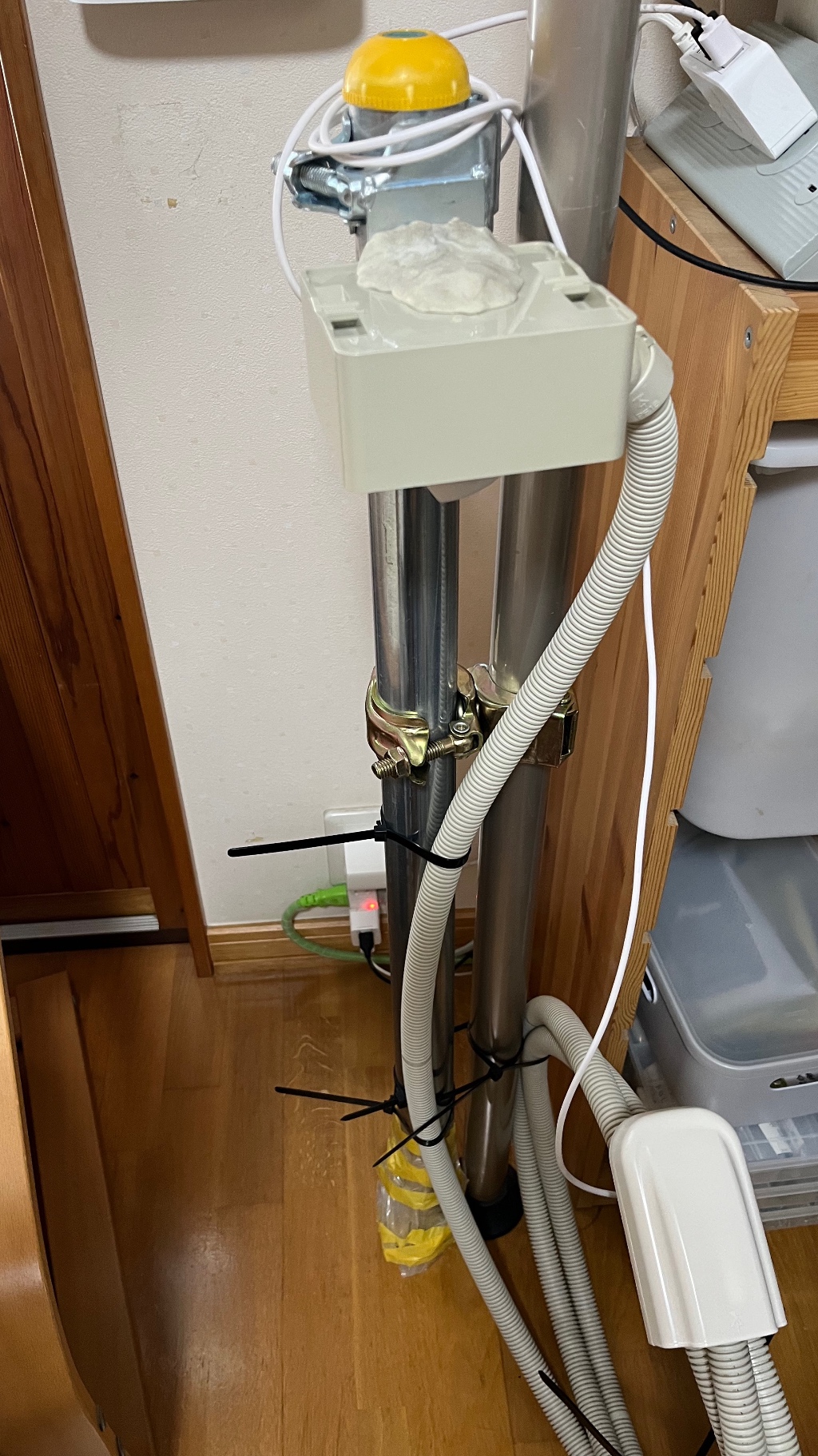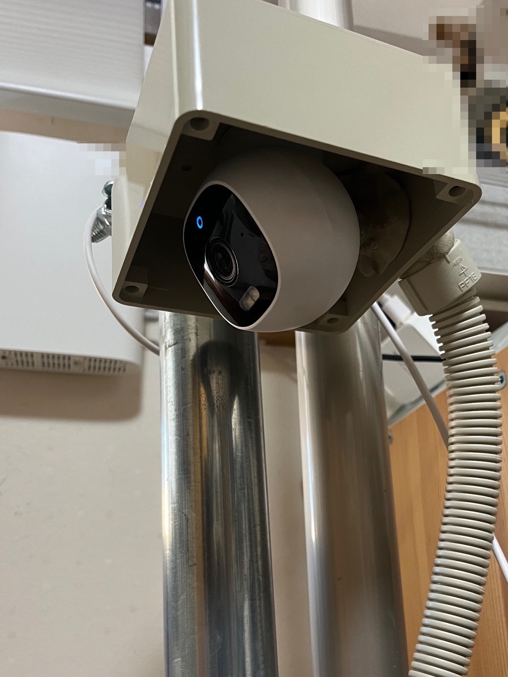 カメラをケースに入れ、単管パイプに懸垂式に固定。耐候性の向上と一見カメラに見えないところを狙いました。電源はUSB。