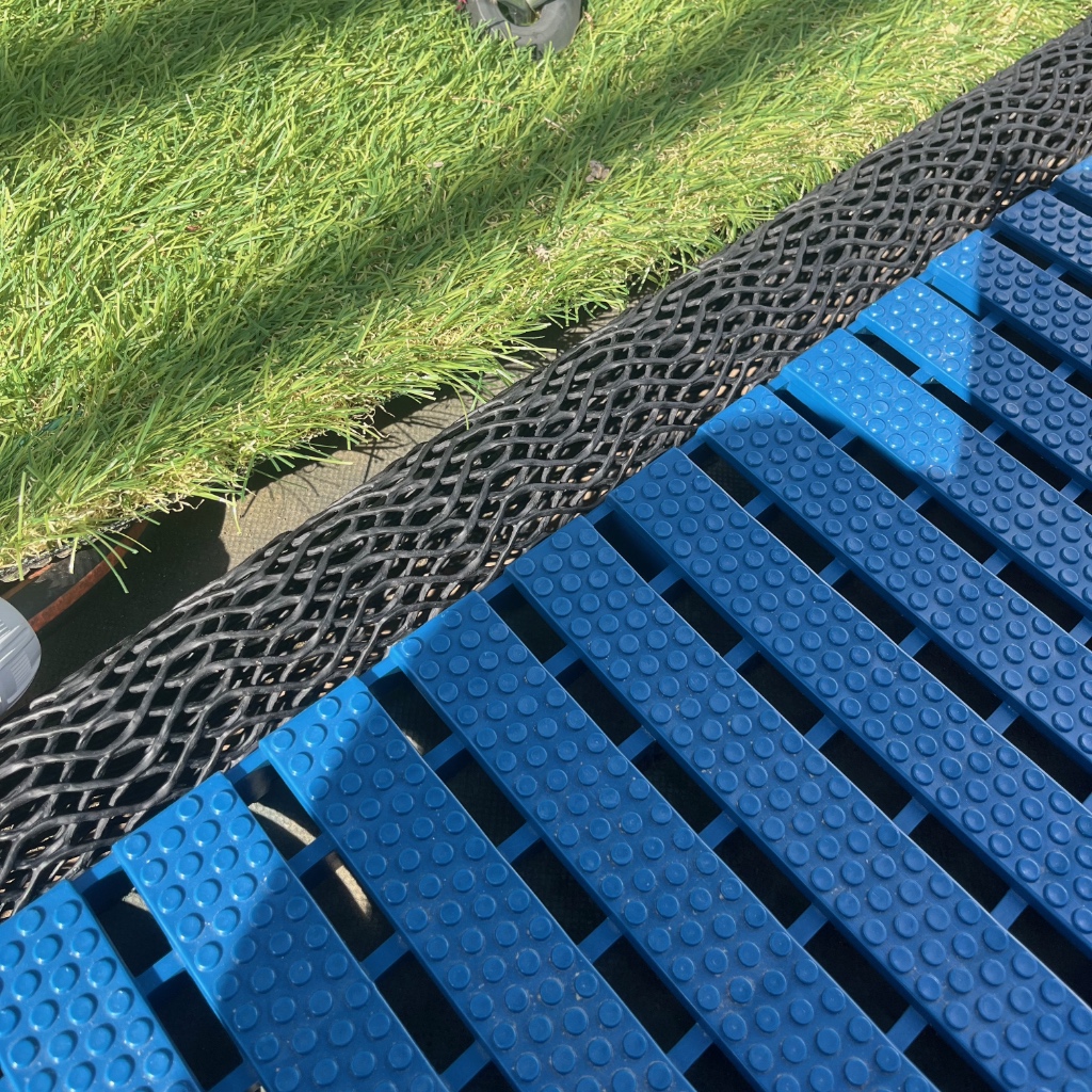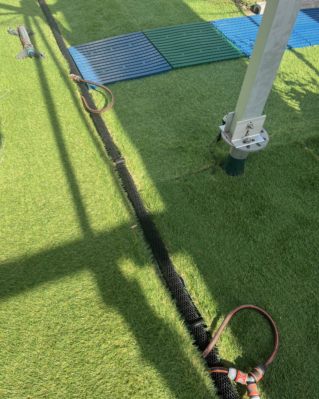 特に圃場中央の排水溝に落葉がたまり、掃除も結構大変なので、雨樋用に売られている『ネトロン枯葉防止パイプ』を設置。