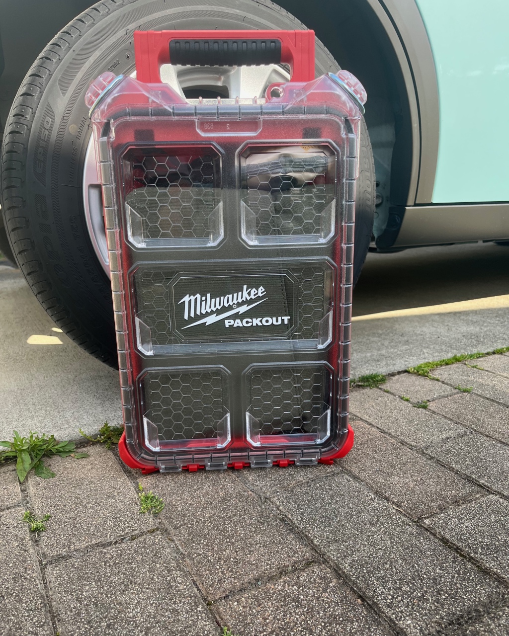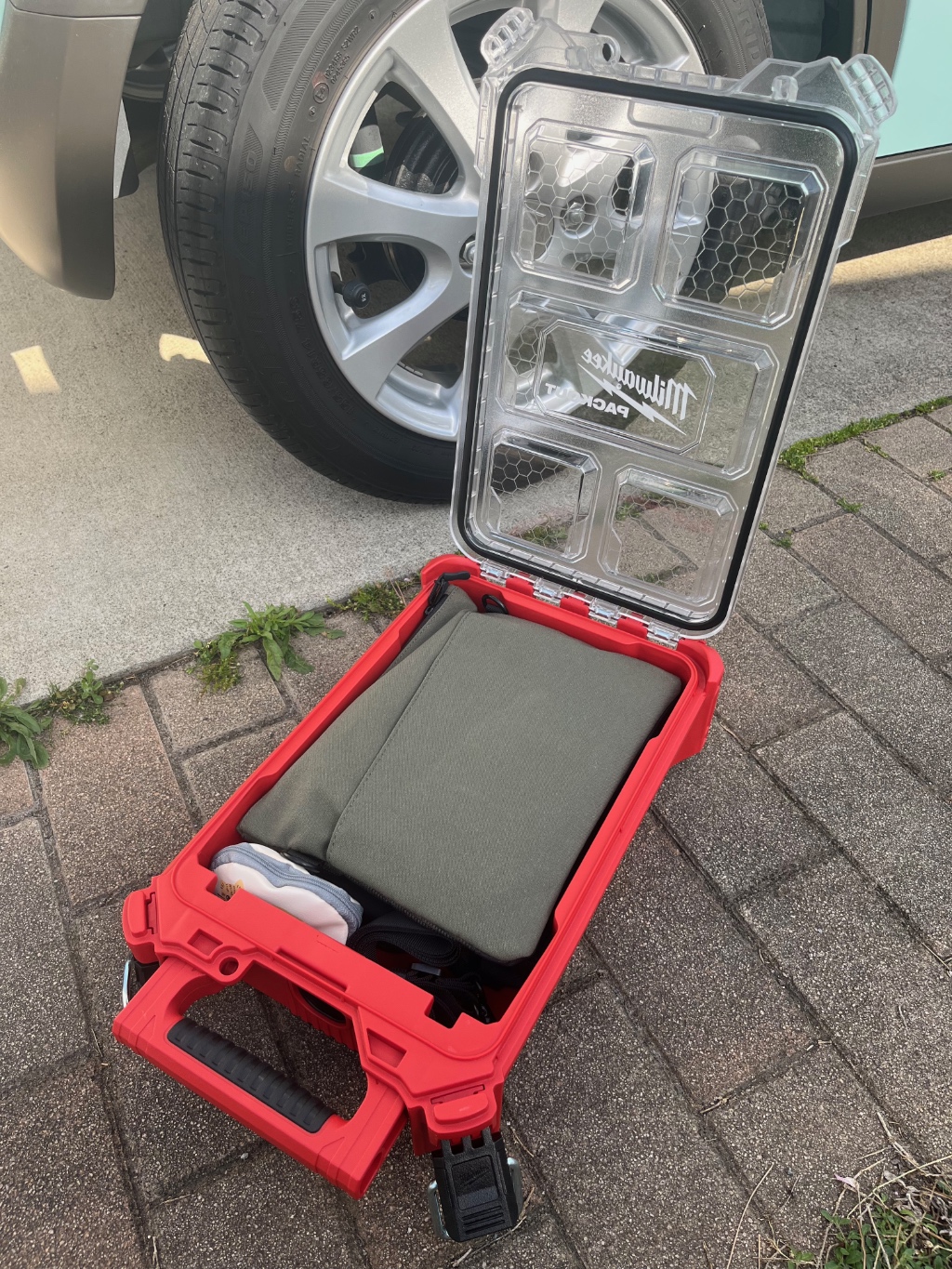 いままでは、家にある大きめの工具箱から100均で買ったプラケースに必要な道具を入れて持ち出していたのですが、忘れ物も良くあるので、車載専用の道具箱を新たに準備。