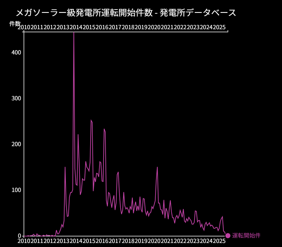下のグラフは単年の運転開始件数ので右肩下がりになっているが、累積数をとれば2013年から2016年に急増した後、右肩上がりのグラフになる。