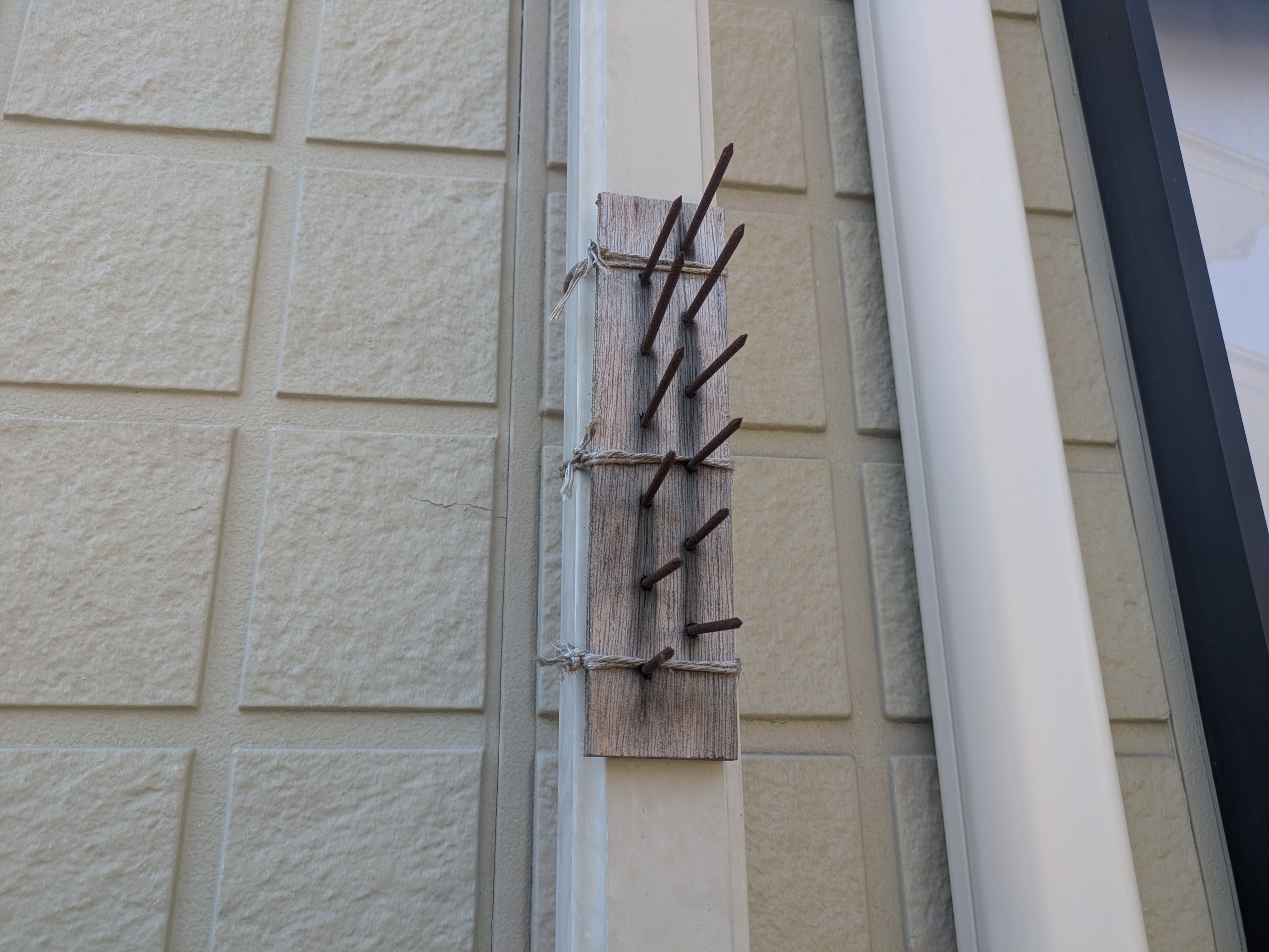 次に、②2階に通じている雨樋に獣返しのようなものを作って取り付けた(小さい板に長めの釘を12本貫通させたもの)。
