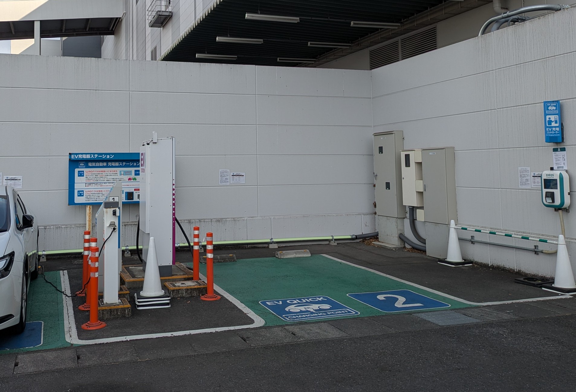 ということで、買物ついでに見に行ったら案の定、私が滞在した1時間の間で急速充電している人はいなかった(左に見える車は普通充電中)。