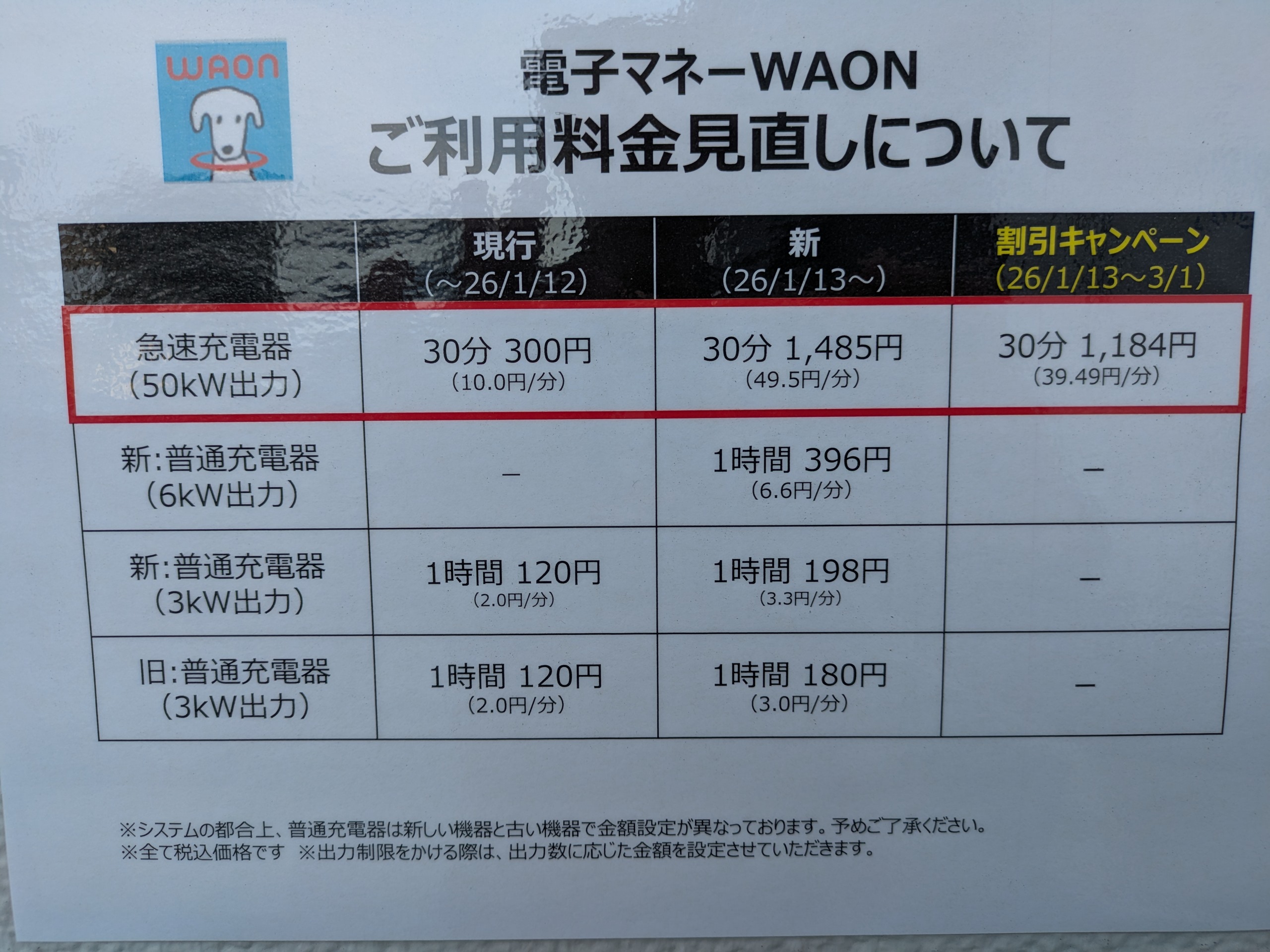 2026年1月13日から大幅値上げとなったイオンモールでのEV急速充電。